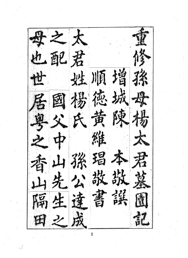 太君姓楊氏,孫公達成之配,國父中山先生之也。世居粵之香山隔田鄉,父勝輝公,清德碩望,有聲於閭里。太君在室時甚得親歡,以孝聞;及歸同邑孫氏,恪守婦道,終其身無懈容,以儉以勤,族婣芘之。有子三:長德彰,一名眉;次德佑,早殤;季徳明,一名文,即國父也。女三:金星、妙茜、秋綺。長孫科,歷長立法、行政、考試三院,胥稱厥軄。