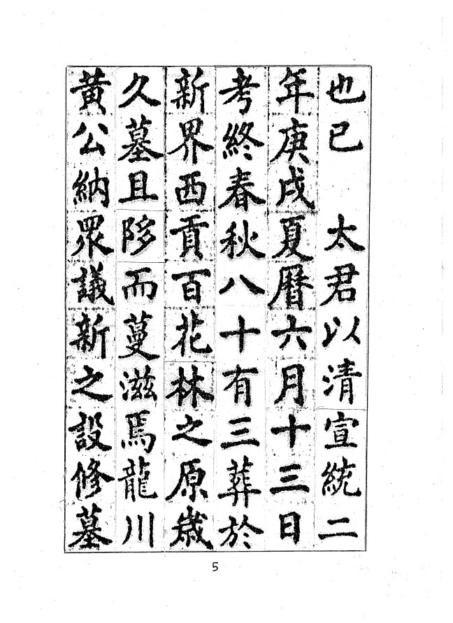 太君以清宣統二年庚戍,農暦六月十三日考終,春秋八十有三,葬於新界西貢百花林之原。嵗久墓且陊而蔓滋焉。龍川黄公納衆議新之,設修墓委員會董其事。披豁翳伏,因故為新,益之以亭,植以嘉木,經始於丁巳之冬,落成於戊午之秋。庶乎來者過而式焉,以瞻以儀,有不僾然如有見,愾然如有聞也乎。