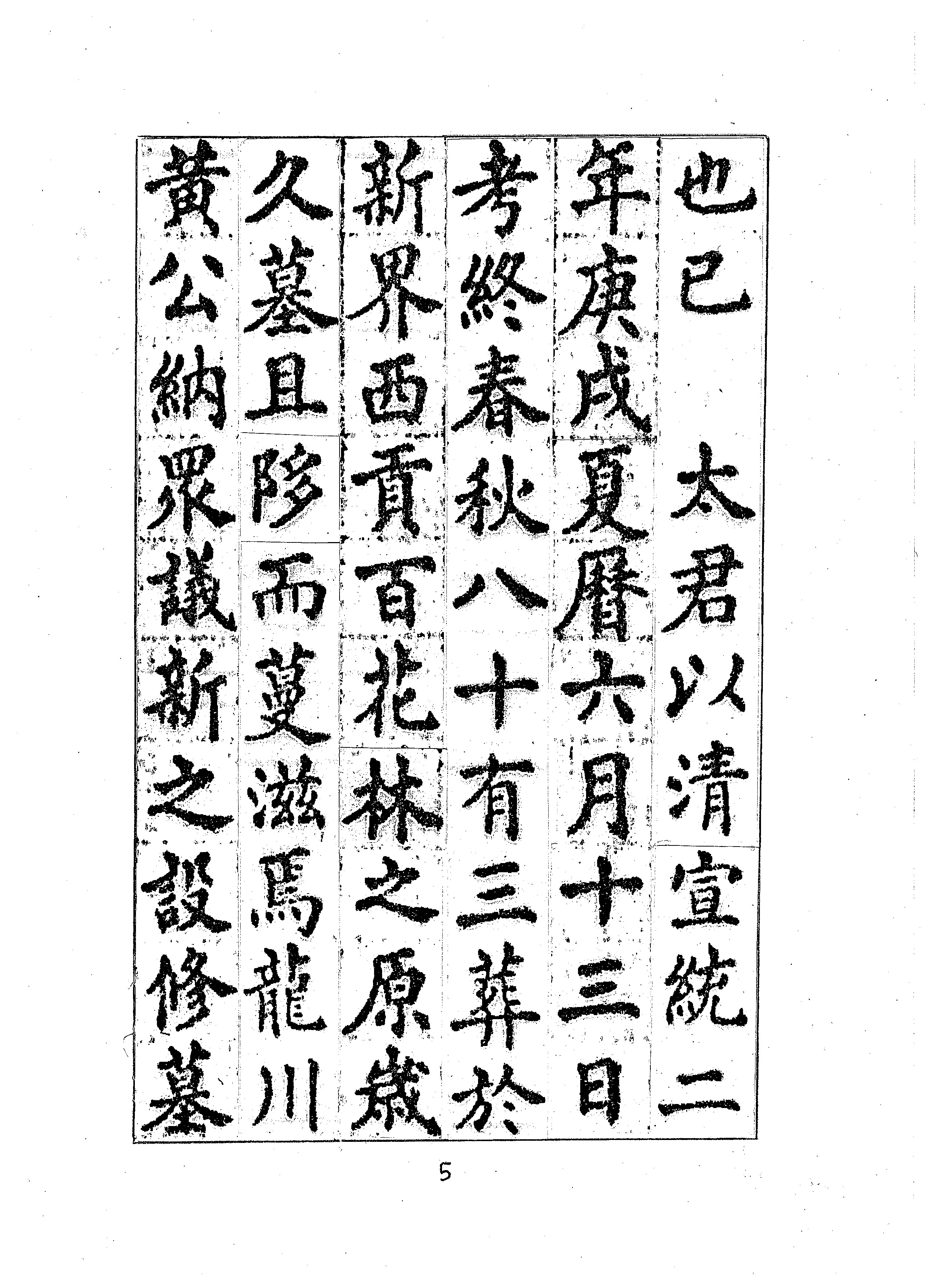 太君以清宣統二年庚戍,農暦六月十三日考終,春秋八十有三,葬於新界西貢百花林之原。嵗久墓且陊而蔓滋焉。龍川黄公納衆議新之,設修墓委員會董其事。披豁翳伏,因故為新,益之以亭,植以嘉木,經始於丁巳之冬,落成於戊午之秋。庶乎來者過而式焉,以瞻以儀,有不僾然如有見,愾然如有聞也乎。