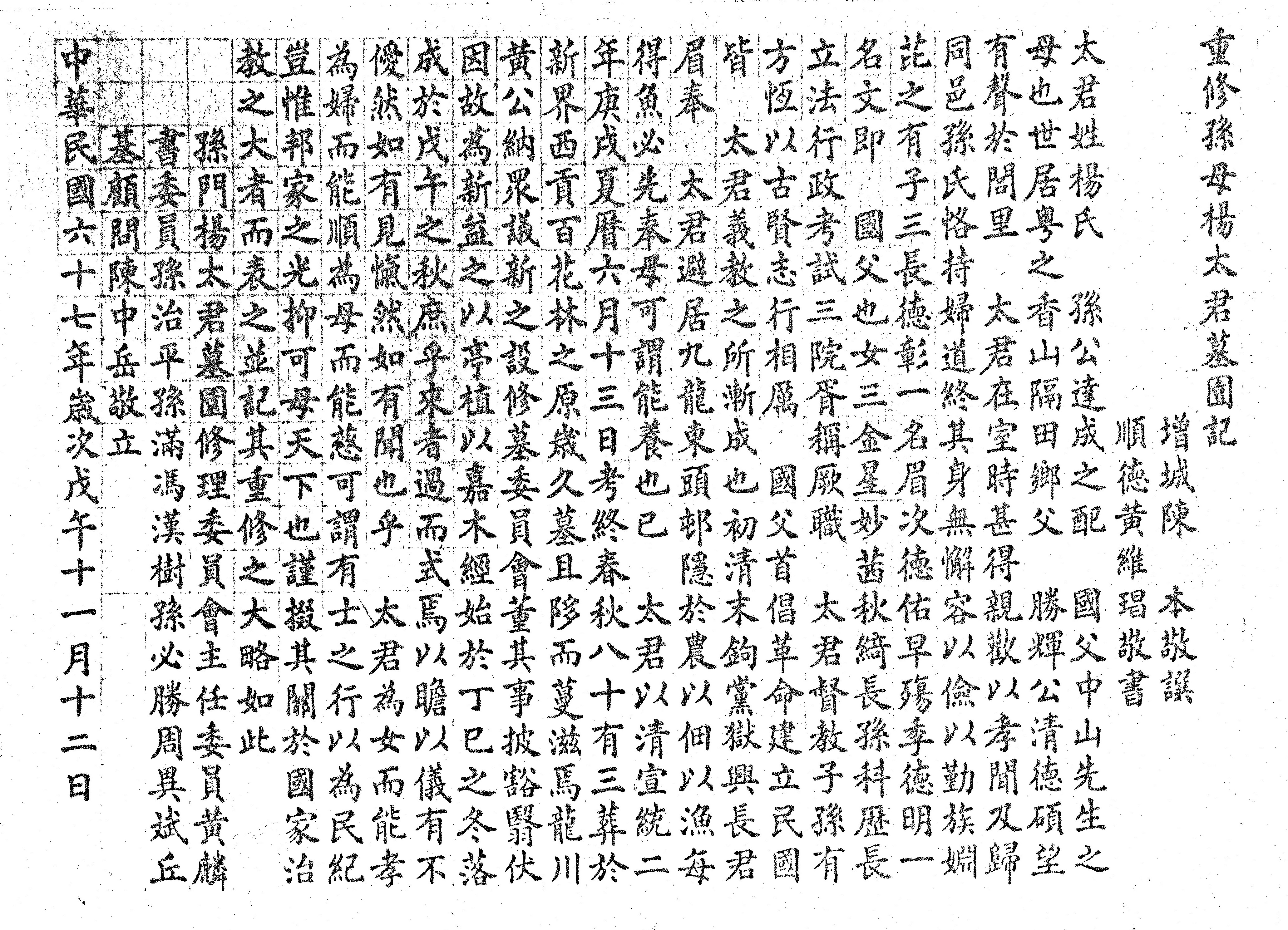 太君姓楊氏,孫公達成之配,國父中山先生之也。世居粵之香山隔田鄉,父勝輝公,清德碩望,有聲於閭里。太君在室時甚得親歡,以孝聞;及歸同邑孫氏,恪守婦道,終其身無懈容,以儉以勤,族婣芘之。有子三:長德彰,一名眉;次德佑,早殤;季徳明,一名文,即國父也。女三:金星、妙茜、秋綺。長孫科,歷長立法、行政、考試三院,胥稱厥軄。