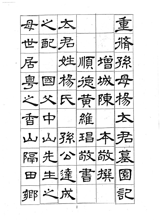 太君姓楊氏,孫公達成之配,國父中山先生之母。世居粵之香山隔田鄉,父勝輝公,清德碩望,有聲於閭里。太君在室時甚得親歡,以孝聞 ; 及歸同邑孫氏,恪守婦道,終身無懈容,以儉以勤,族婣芘之。有子三:長德彰,一名眉;次德佑,早殤;季徳明,一名文,即國父也。女三:金星、妙茜、秋綺。長孫科,承先繼志,戮力革命,首倡市政,歷任廣州市市長,廣東省建設廳長,國民政府交通、財政、鐵道等部部長,國民政府副主席,立法、行政、考試等院院長。 胥稱厥軄,樹建弘多。至迭次促進黨國團結,臨危受命,達成北伐、統一、抗戰、行憲偉業,尤功在國家。