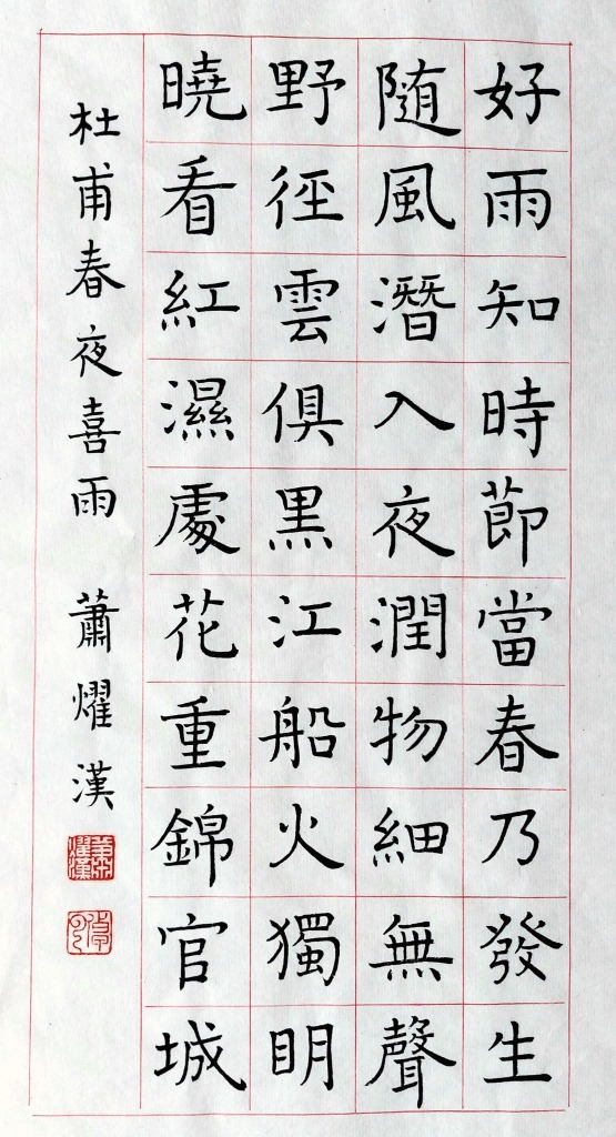 肅宗上元二年 (761),五十歲的杜甫作此詩於成都。此詩以極大的喜悅之情細緻地描寫了春雨的特點和成都夜雨的景像。