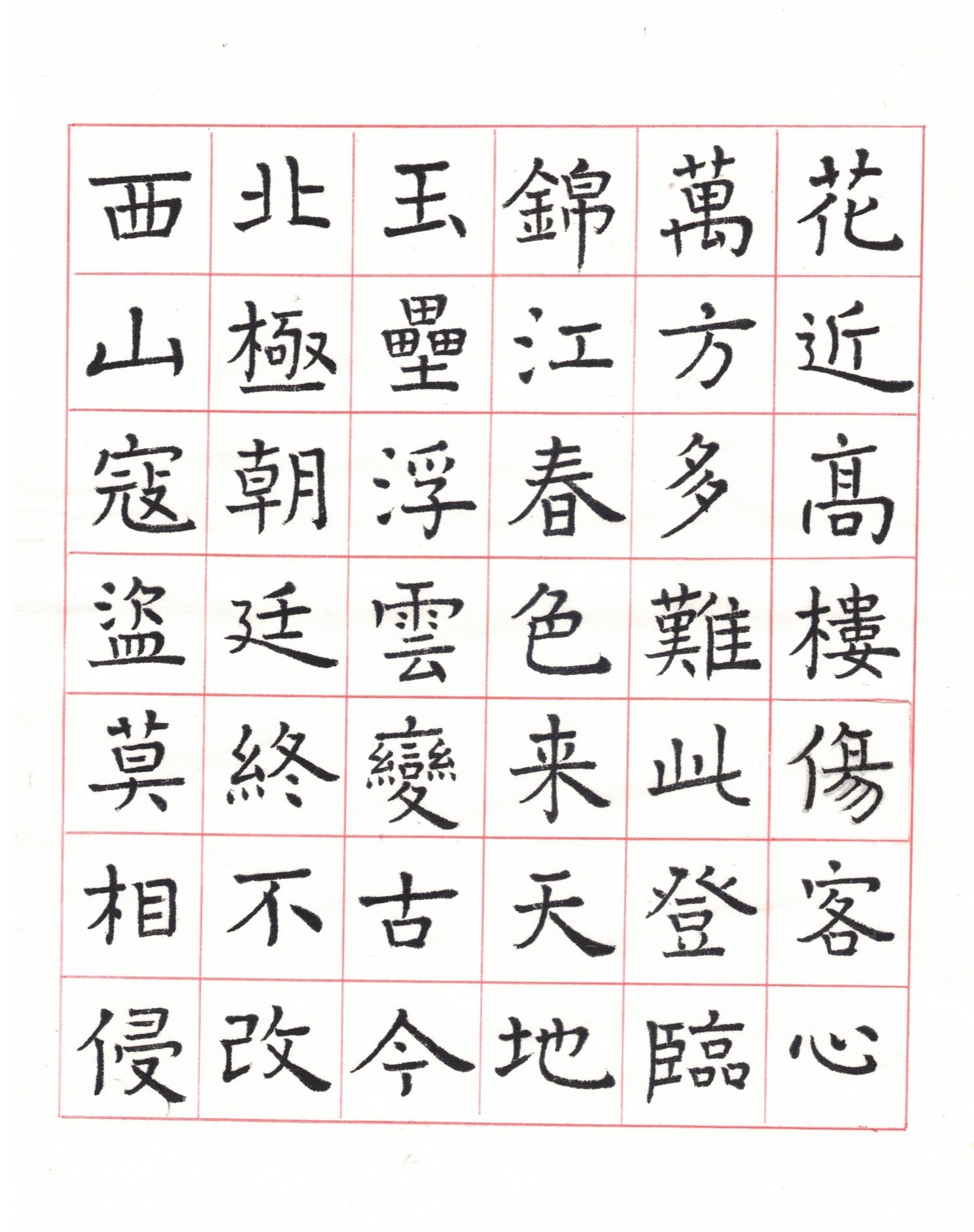 用網上 Apps ‘雲章書法字典’ Yunzhang calligraphy dictionary 集合了適當的字體,作為範本。雖然每一個字都結構精美,但字體不是出於一人的手筆,風格不同,加上大小不一,筆劃粗幼各異,所以要加整理,希望臨寫到風格統一。用唐楷寫杜工部的詩集, 確實是賞心樂事。