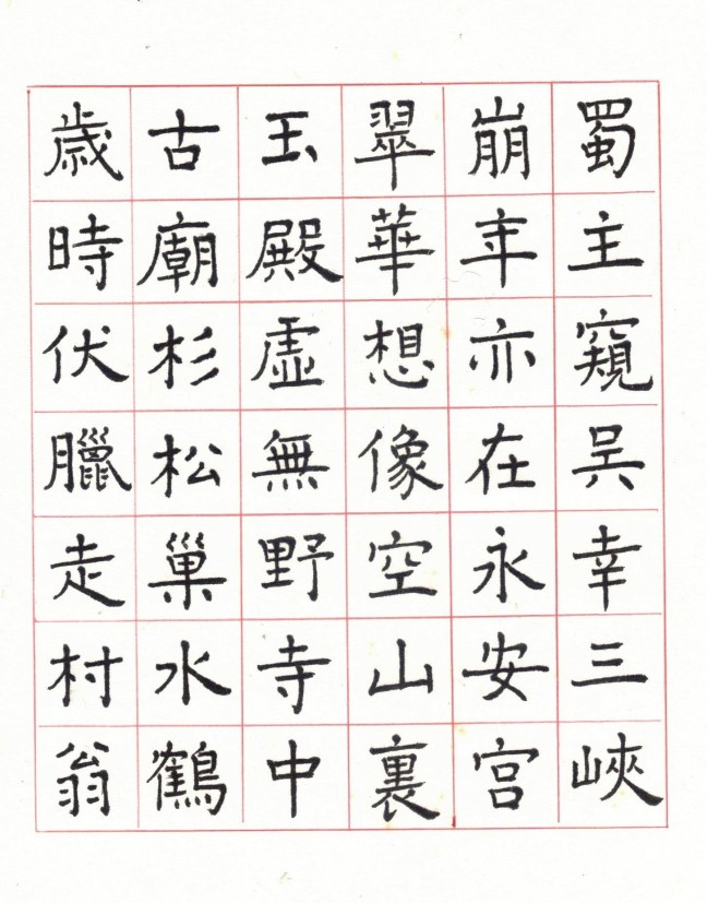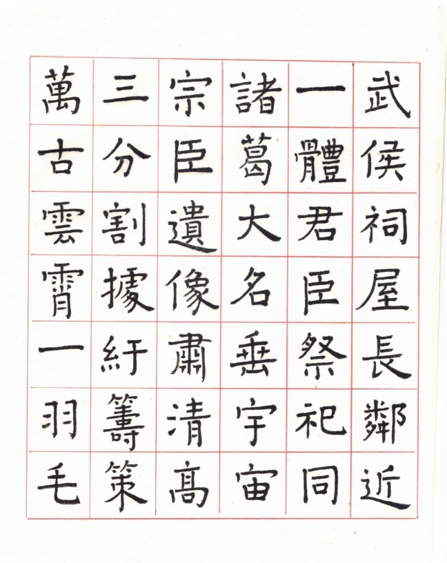 用網上 Apps ‘雲章書法字典’ Yunzhang calligraphy dictionary 集合了適當的字體,作為範本。雖然每一個字都結構精美,但字體不是出於一人的手筆,風格不同,加上大小不一,筆劃粗幼各異,所以要加整理,希望臨寫到風格統一。用唐楷寫杜工部的詩集, 確實是賞心樂事。