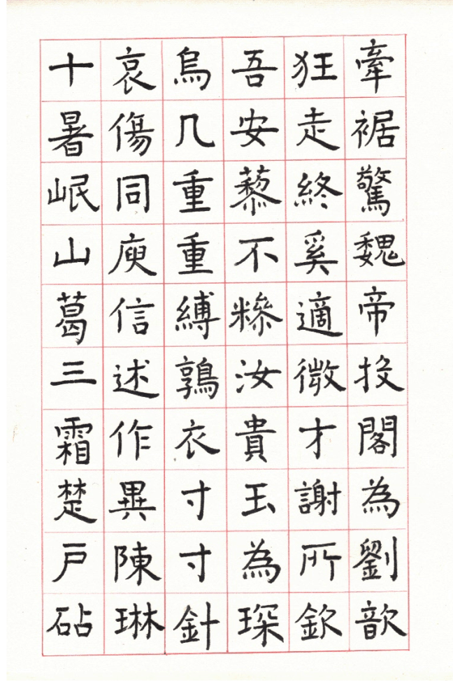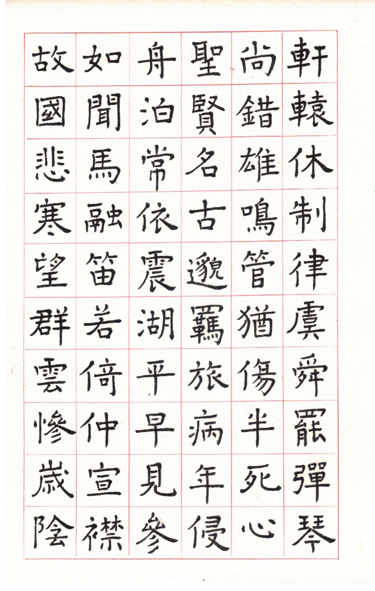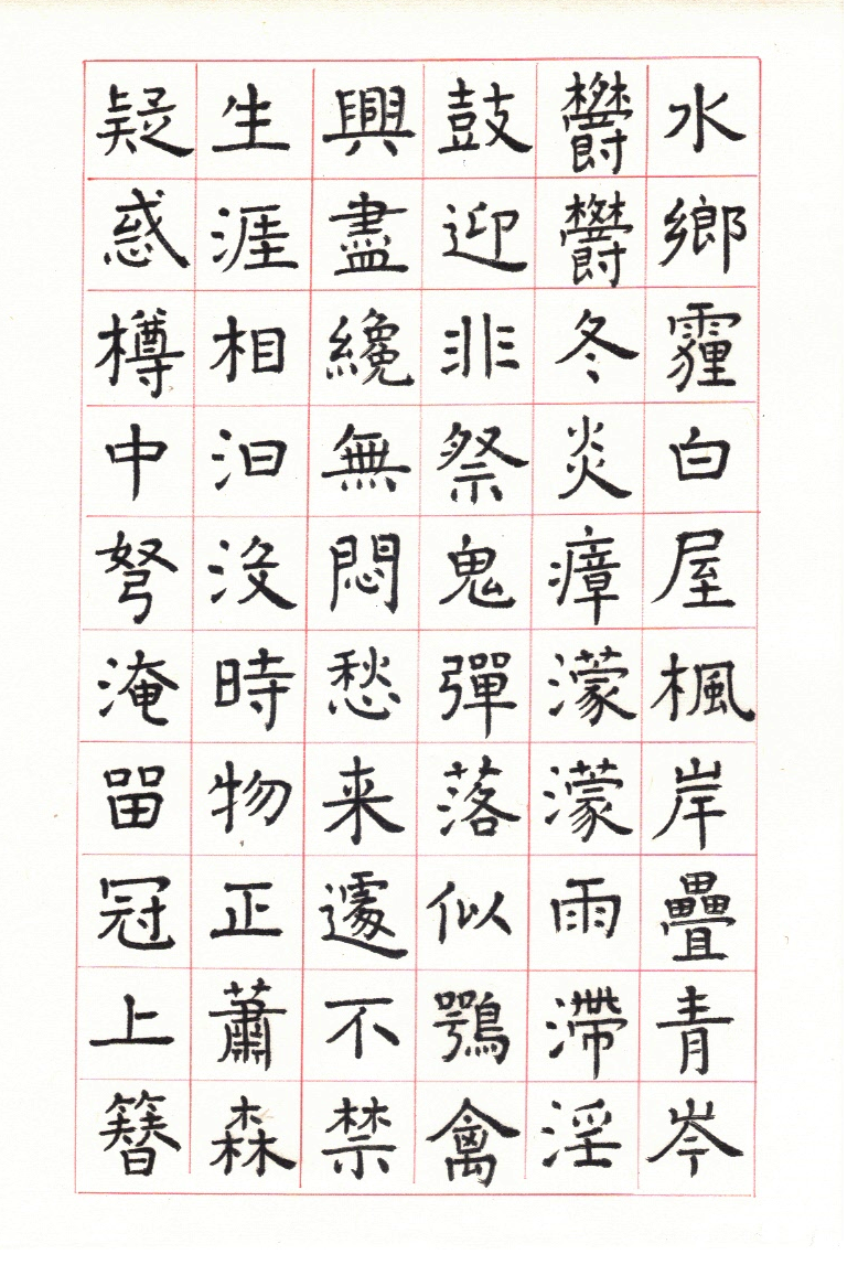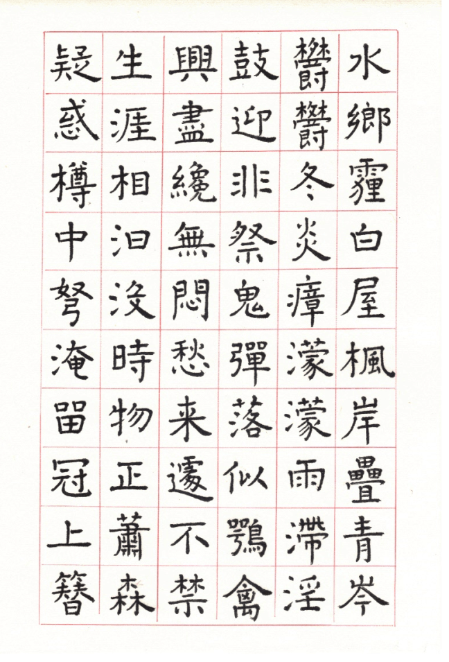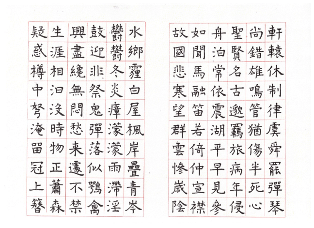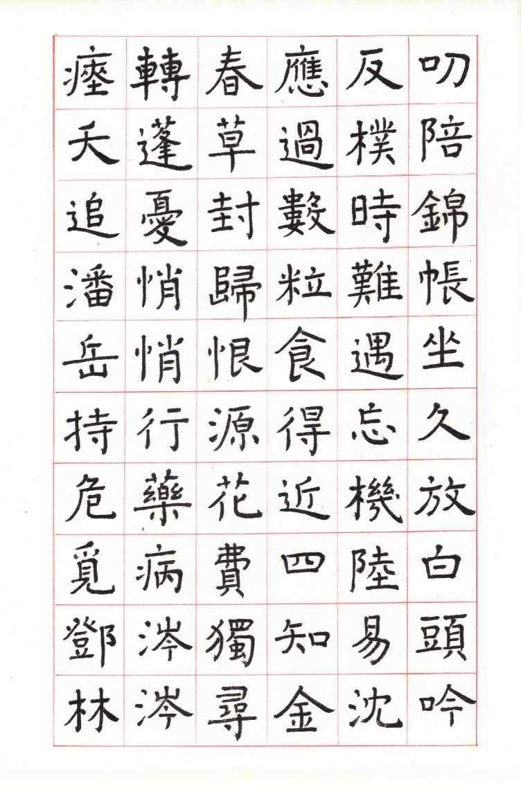 用網上 Apps ‘雲章書法字典’ Yunzhang calligraphy dictionary 集合了適當的字體,作為範本。雖然每一個字都結構精美,但字體不是出於一人的手筆,風格不同,加上大小不一,筆劃粗幼各異,所以要加整理,希望臨寫到風格統一。用唐楷寫杜工部的詩集, 確實是賞心樂事。