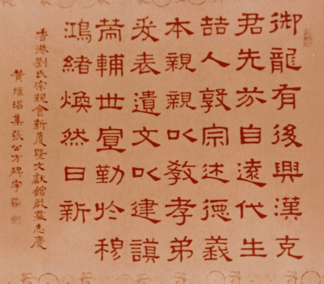 Professor Wong composed and wrote this piece about the ancestry of the Lau clan and the good relationship among its people. This piece was to commemorate the Opening Ceremony of the New Building and the Cultural Centre (文獻館) of the Lau Clan Association. The Cultural Centre keeps historical documents of the Association.