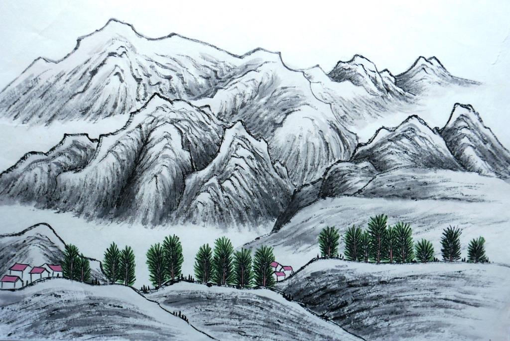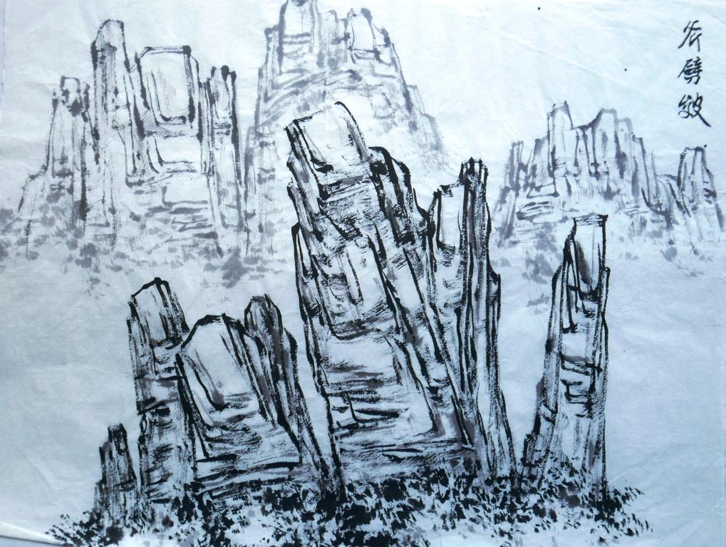 Searing on Rocks – Axe-shaped shading 斧劈皴 , ink on paper, 33 x 45 cm