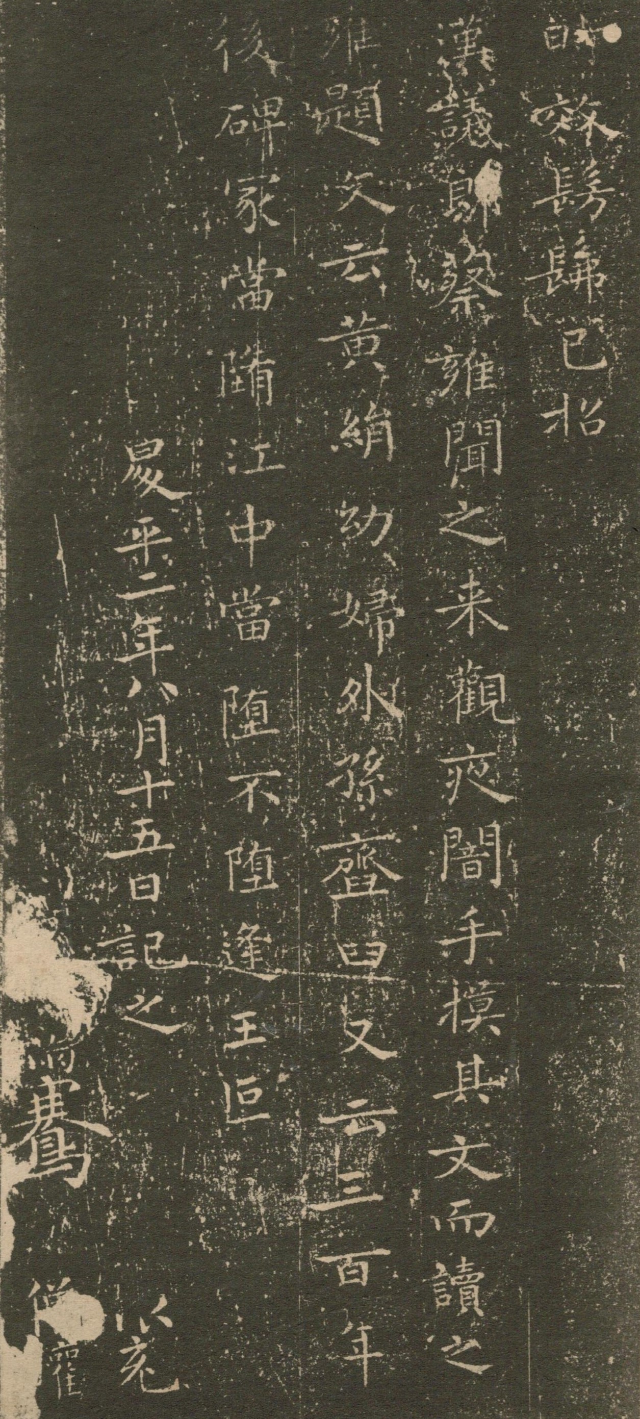 銘曰:名勒金石,質之乾坤。歲數歷祀,立墓(廟)起墳。光于(於)後土,顯照天人。生賤死貴,義之利門。何悵華落,飄零早分。葩艷窈窕,永世配神。若堯二女,為湘夫人。時效仿佛,以昭後昆。