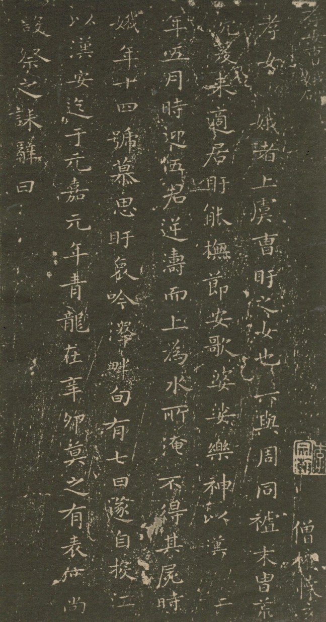 (碑文) 孝女曹娥者,上虞曹盱之女也。其先與周同祖,末胄荒流,爰來(茲)適居。盱能撫節安(按)歌,婆娑樂神。漢安二年五月五日迎伍君,逆濤而上,為水所淹,不得其屍。時娥年十四(歲),號慕思盱,哀吟澤畔,旬有七日,遂自投江死,經五日抱父屍出。以漢安迄于(於)元嘉元年青龍辛卯,莫之有表。度尚設祭誄之。