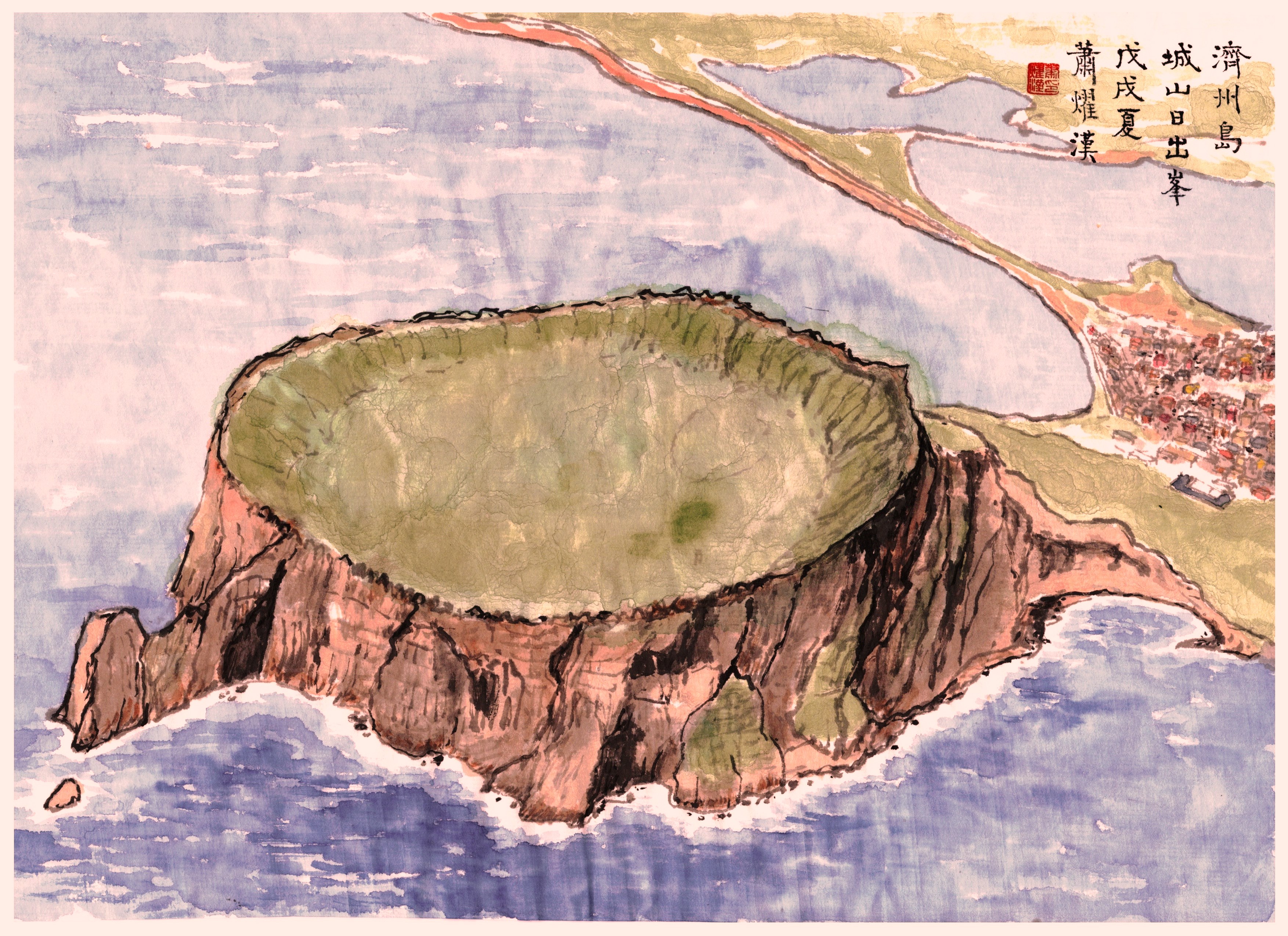The actual name of Sunrise Peak (城山日出峯) is Seongsan Ilchulbong. It is a typical tuff cone formed by hydrovolcanic eruptions upon a shallow sea bed about 5 thousand years ago. It is situated on the eastern seaboard of Jeju Island (濟州島). Sunrise Peak is said to resemble a gigantic ancient castle. This tuff cone is 182 meters high, has a preserved bowl-like crater and also displays diverse inner structures resulting from the sea cliff.