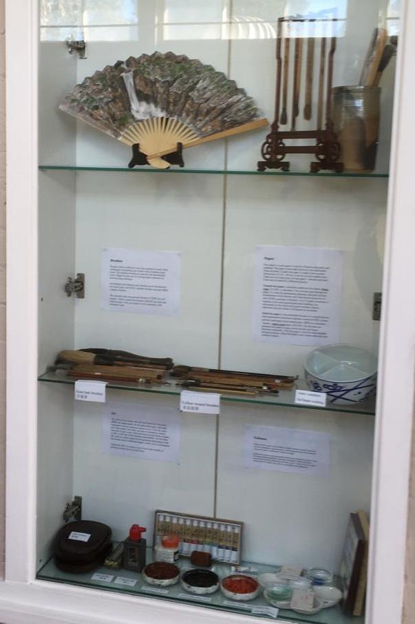 Stationery on display – including ink stone, ink stick, pigments of various kinds, goat hair brushes, yellow weasel hair brushes, palette, water containers, and brush stand.
