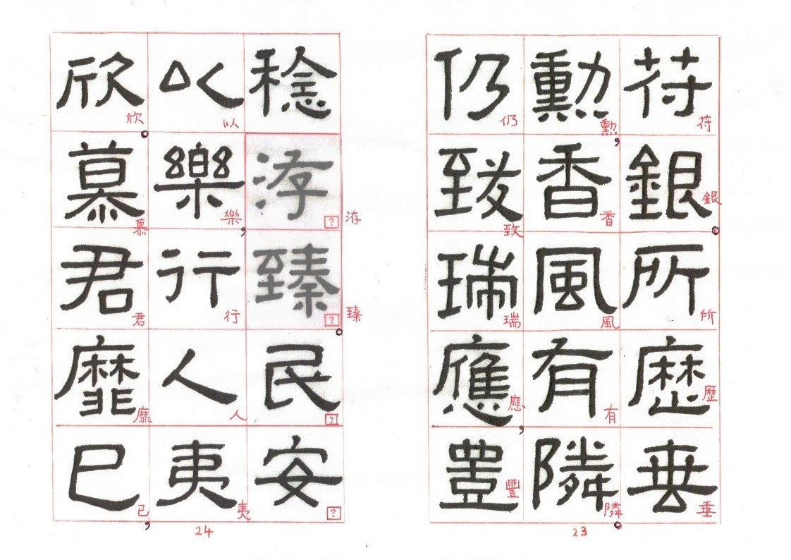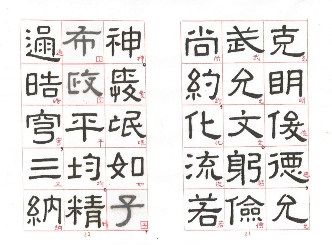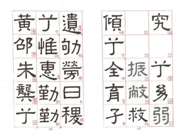 The following is my copy of the Fu Ge Song. Some missing characters have also been added to the best of my knowledge. Each of those characters in small red regular scripts are enclosed by a square □ . Those substitute characters may be far from perfect, but I will keep trying to improve and update those missing characters.
