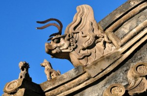 Chiwen (螭吻) is a fish-like, hornless dragons with a truncated body and a wild mouth. They are placed along roof ridges to guard against fire.