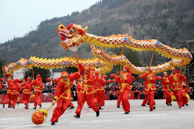 Dragon dance (舞龍) is often performed during the Chinese New Year. The dance is performed by a team of experienced dancers who manipulate a long flexible giant puppet of a dragon using poles positioned at regular intervals along the length of the dragon. It is believed dragon dance can bring good luck to people.