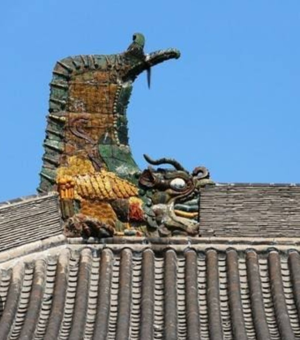 Chiwen (螭吻) is a fish-like, hornless dragons with a truncated body and a wild mouth. They are placed along roof ridges to guard against fire.