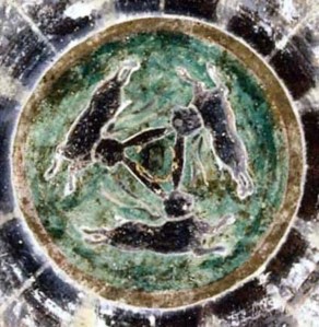 The ceiling of the 407 Cave of Maogao Cave, Dunhuang was decorated with relief carving of 3 rabbits in the centre. A huge Buddha statue with his disciples is facing the front.The ceiling of the caveThe central part of the ceilingThree rabbits with ears forming a circle chasing each other 三兔共耳相逐藻井
