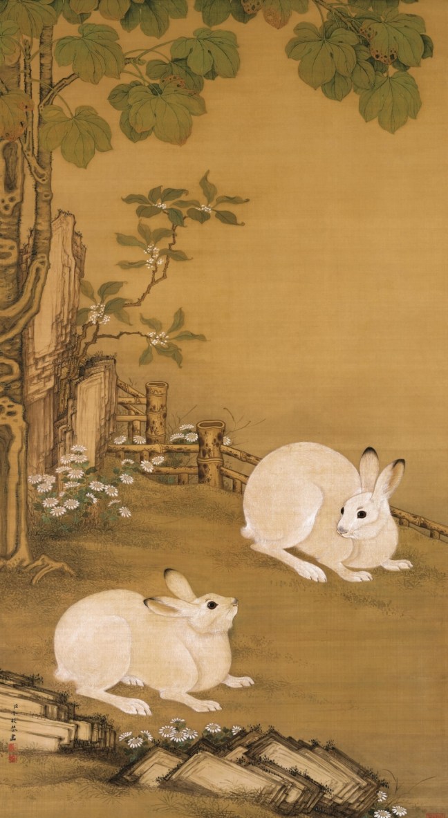 Leng Mei (冷枚), Qing Dynasty, Two rabbits under Chinese parasol / phoenix tree (梧桐雙兔圖), ink and watercolour on silk, 176.2 x 95 cm, The Palace Museum (Beijing)