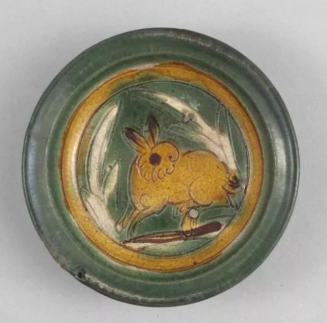 Liao (916-1125 CE) Three-color (yellow, green & white) small dish with engraved rabbit pattern (遼 三彩刻花兔紋小碟), top diameter 12.2 cm, base diameter 7.5 cm, height 3.1 cm