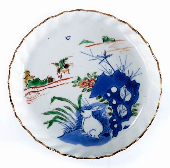 Ming (1368-1644) Tianqi Imitation Chenghua (blue and white) porcelain plate with rabbit pattern and serrated rim (明 天啟仿成化款青花兔紋菱花口盤)Side view of the above