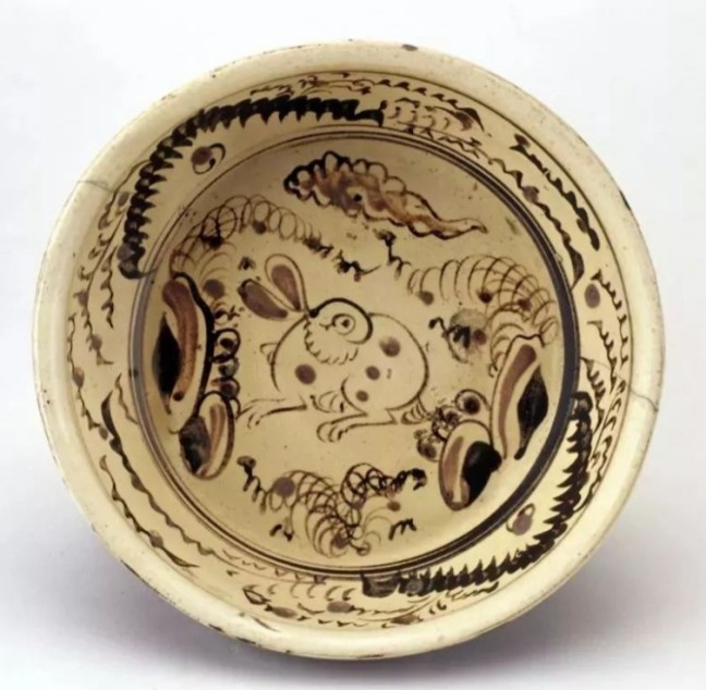 Ming (1368-1644) Pengcheng kiln porcelain basin with black glaze outside, white glaze inside with black flower and rabbit patterns (明彭城窯白地黑花兔紋盆), top diameter 19 cm, base diameter 13.5 cm, height 6.5 cmSide view of the above