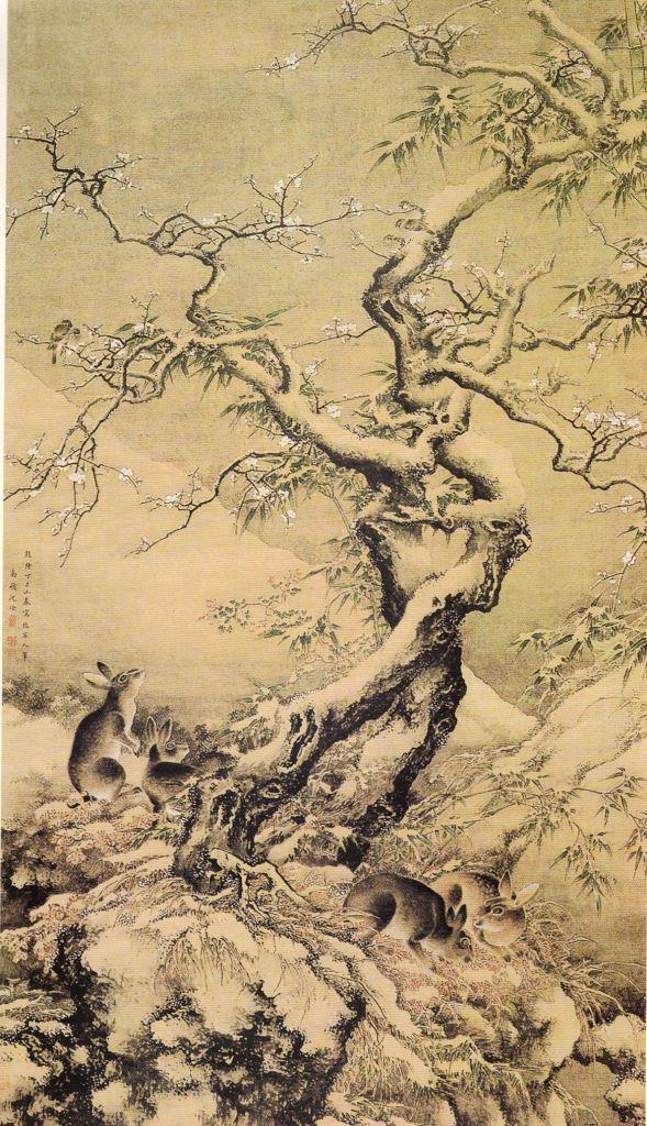 Shen Quan (沈銓), active around 1731, Rabbits playing in the snow (雪中游兔圓), ink and watercolour on silk, 230.5 × 131.7 cm, Sen-oku Hakuko Kan. Kyoto, Japan (日本泉屋博古館)Details of the above painting