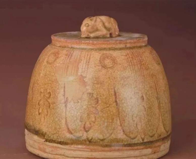 Sui (581-618 CE) Celadon glazedquán (weight) with rabbit button on top and lotus leaves pattern on the side (隋 青釉兔紐蓮瓣紋權), height 12 cm, base diameter 12.7 cm