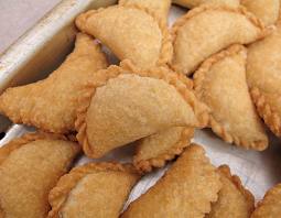 Jin deui / zhi-ma-qiu (煎堆, 芝麻球, deep fried glutinous rice balls) and jau gok (油角, deep fried glutinous rice dumplings). The pastry is coated with sesame seeds on the outside and is crisp and chewy. Inside the pastry is a large hollow, caused by the expansion of the dough. The hollow of the pastry is filled with sweet lotus paste (蓮蓉) or sweet red bean paste (紅豆沙). As the rice balls or the rice dumplings inflate, your wallets also expand.