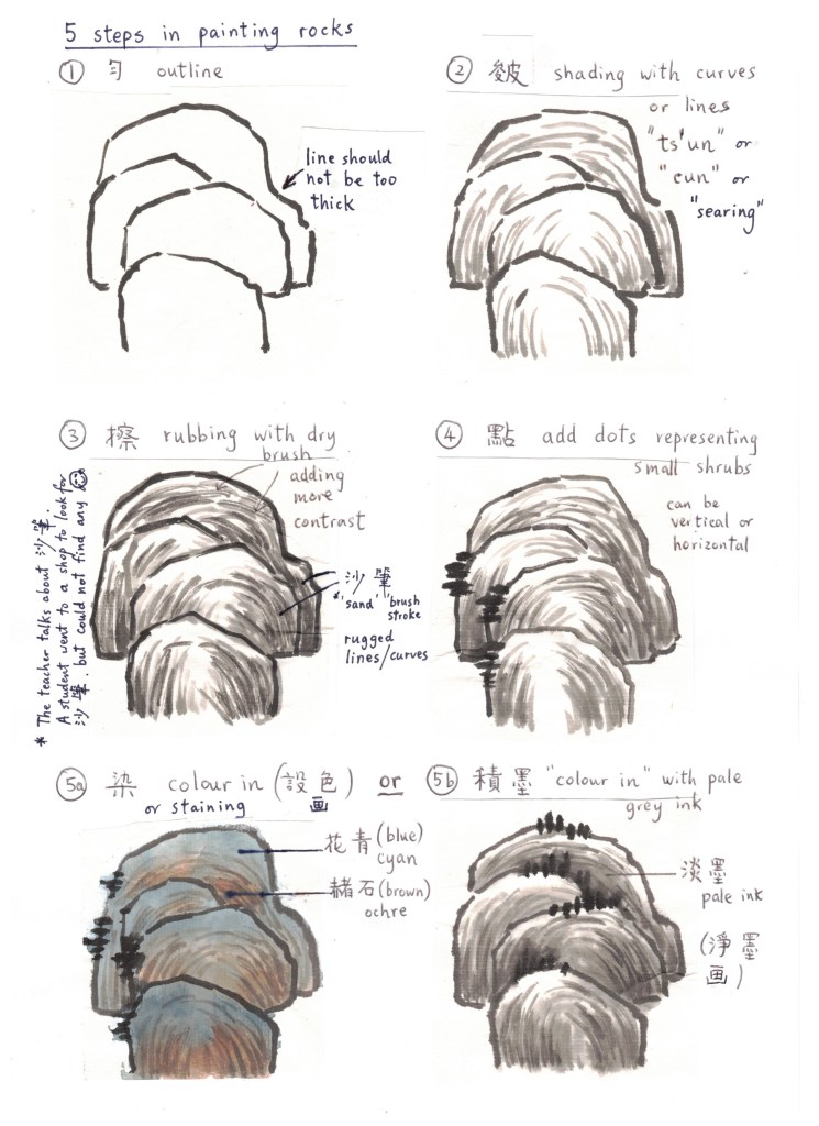 (2) Add shading (ts’un / cun / searing) (皴). There are a few different types of ts’un, the ts’un we use in this painting is called hemp-fibre ts’un (披麻皴).
