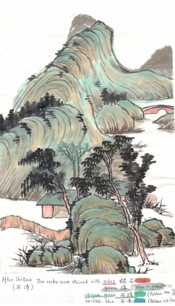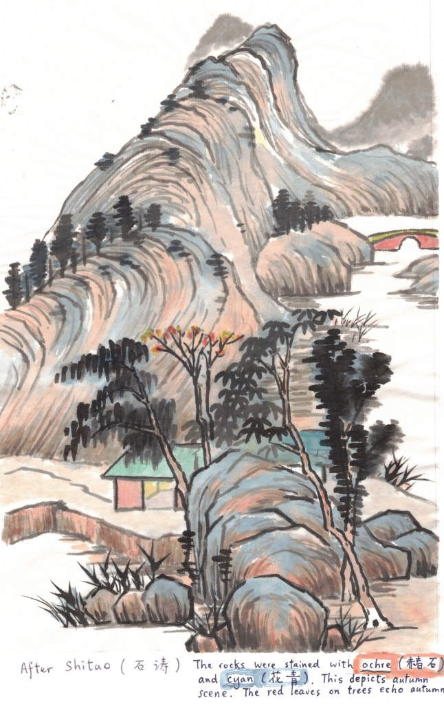 The original painting by Shitao is ink painting, with no colours. We can take the liberty of adding some colours onto it. Colours may hide the imperfections of the brush strokes.