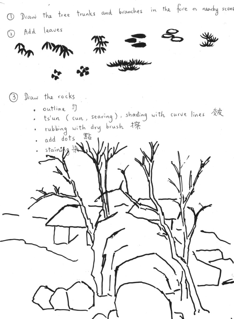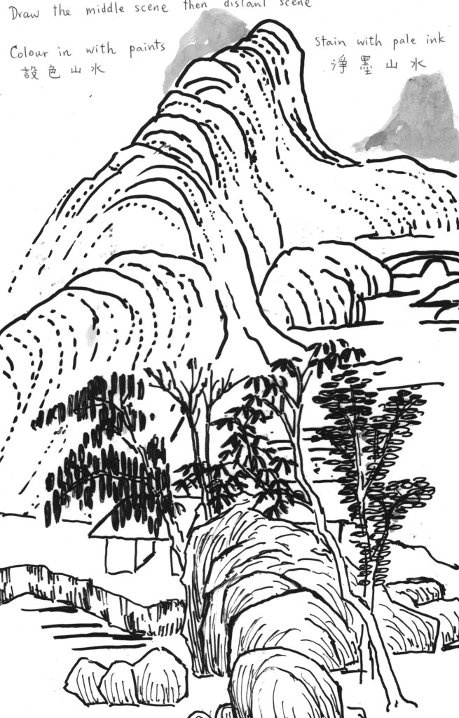 (5) Colour-in or stain (染) the trees and rocks / hills with colour or with pale ink of various shades