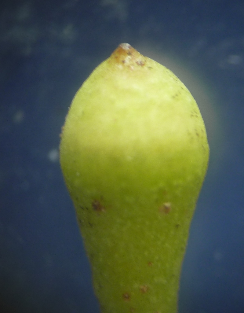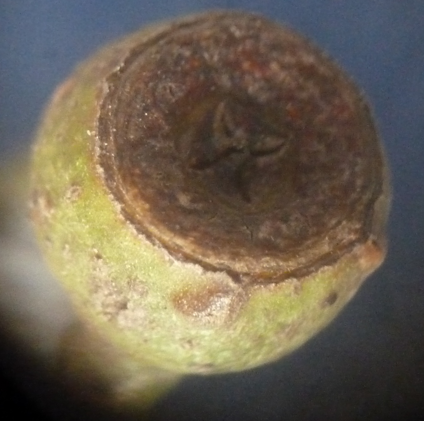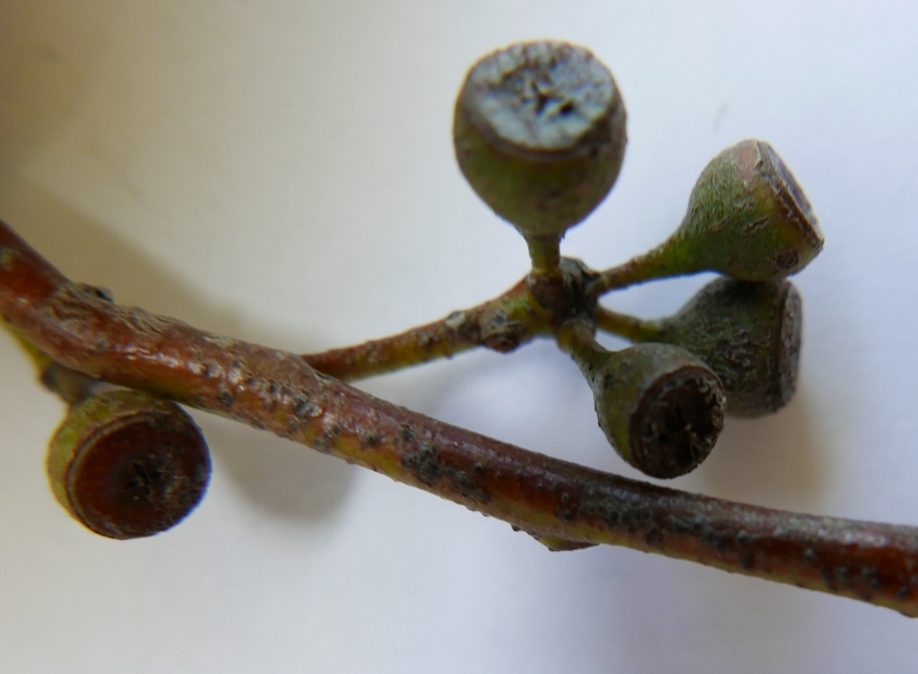 The male nuclei fertilize the female nuclei in the ovule. The ovule develops into a seed. The ovary becomes a fruit (gum nut). The fruit is barrel-shaped, 4 locular, 4-5 mm long, 5-6 mm in diameter. It has 4 valves at rim-level.