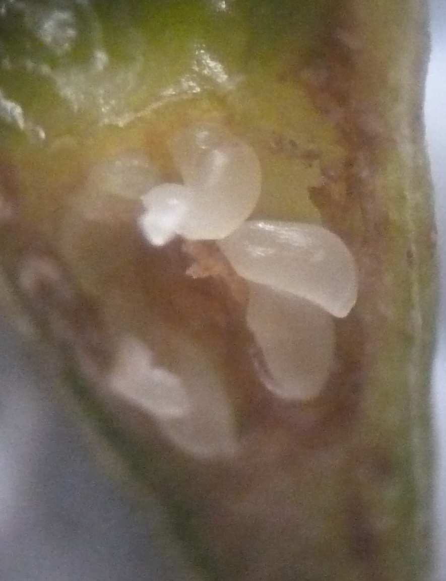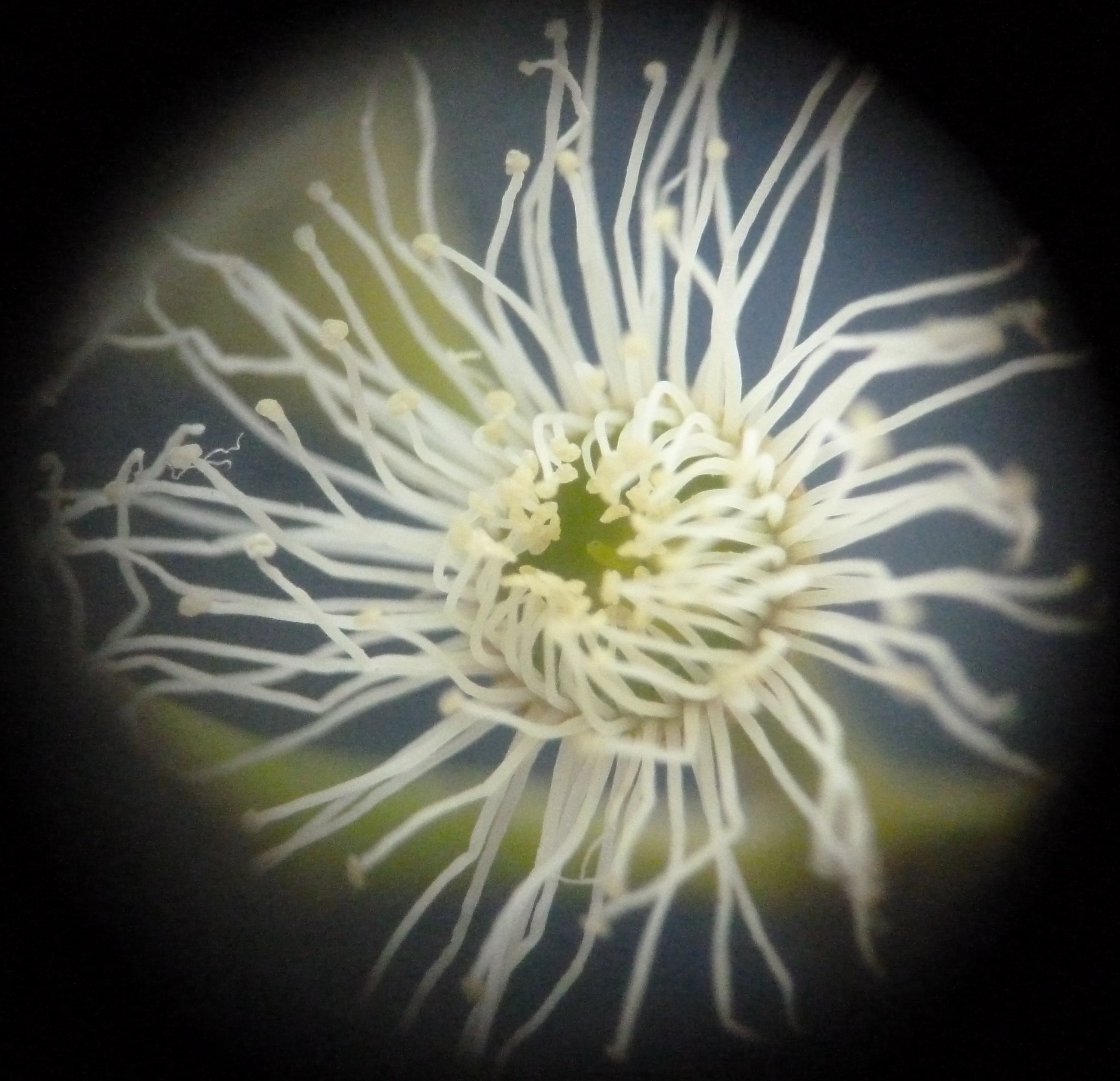The operculum splits open to release the stamens. Stamens are male reproductive structures made up of anthers and filaments. The anthers produce pollen grains.