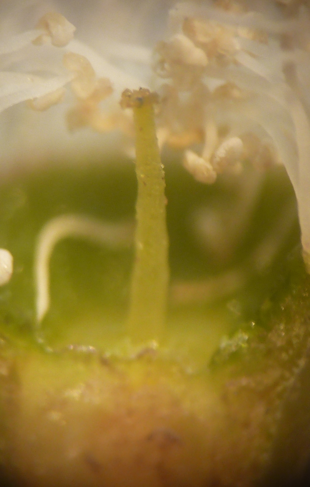 The female reproductive structure is called the pistil. It is made up of the stigma, style and ovary. The stigma receives pollen grains. The male nuclei of the pollen grains transferred through the tissue of the style into the ovary. The ovary comprises of 4 carpels. Each carpel contains numerous ovules.