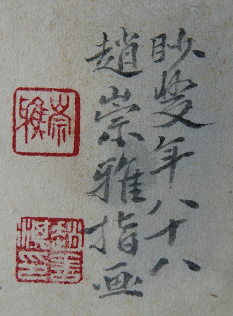 Chiu Soong-ngar (趙崇雅), also known as Chiu Sin-kee (趙善淇) (1919 – 2015) was a native of Xīn Hu, Guangdong (廣東, 新會). He loved writing Chinese poems and Chinese painting since his childhood. He learnt Chinese painting with Mr Li Fenggong (李鳳公). At the later years he called himself ‘an old man with poor vision of one eye 眇叟’.