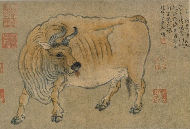 The poem talked about the ox wearing a bridle with four other idle oxen. Qianlong read into the painting that they were about the lofty sentiment of Tao Hongjing (陶弘景) and the wise counsel of Bing Ji (丙吉).