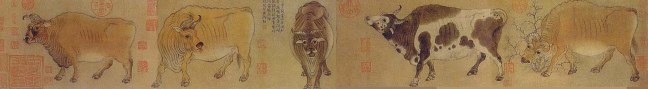 In 783, due to Zhu Ci’s (朱泚) rebellion, the Tang Empire was thrown into confusion. Emperor Dezong fled from the capital Chang’an (長安) to Feng Tian (奉天). At that time Han Huang was the military governor (Jiedeshi節度使) of Zhenhai (鎮海). His well-trained soldiers participated in the rescue Emperor Dezong who finally returned to Chang’an. Unfortunately some wicked officials spoke ill of Han Huang and told the Emperor that Han Huang was so powerful that he might rebel and overthrow the Dynasty. The chancellor Li Mi (李泌) convinced Dezong that Han was loyal and faithful. According to some art historians, this Five Oxen painting was done at the time to show the Emperor that he was loyal and faithful like an ox serving the farmer.