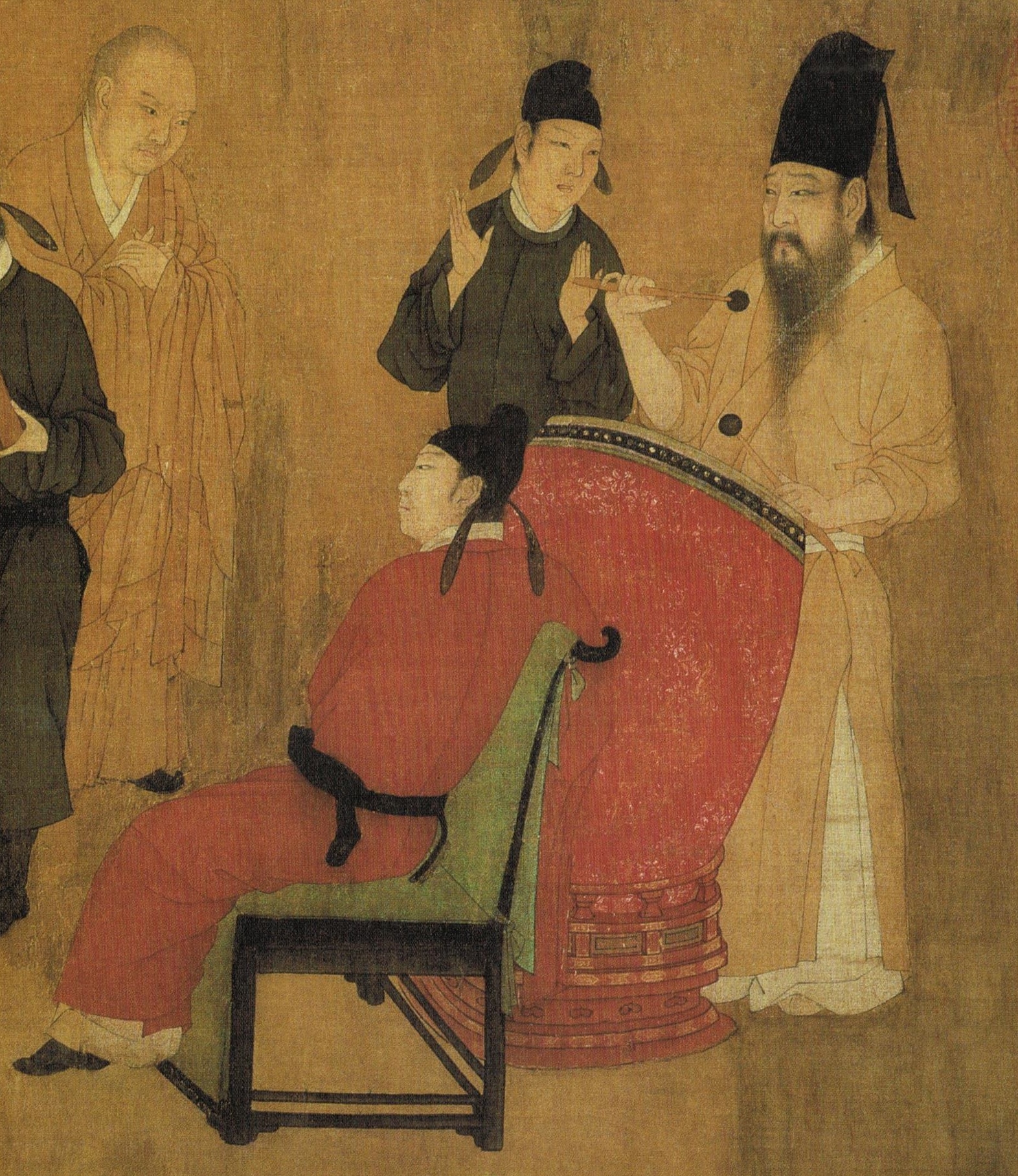 Despite the painting is a visual record of the excess and self-indulgence in Han Xizai’s home, Han does not look happy and joyful. Instead the lack of expression on his face may depict he is confused, depressed and unhappy. This supports the theory that Han has put on these parties to dispel the Emperor’s suspicion.