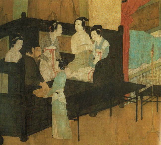 Gu Hongzhong (顧閎中) (937 – 975) was a court-painter in the painting academy of the Southern Tang dynasty during the Five Dynasty and Ten Kingdoms (五代十國) period. Gu excelled at figure painting. Emperor Li Yu sent Gu to spy on one of Han’s infamously erotic parties. Two more artist-officials, Zhou Wenzhong (周文矩) and Gāo Tàichōng (高太沖) were also dispatched to secretly observe Han Xizai to not only bear witness to the rumored night revels, but produce a record of the scenes there.