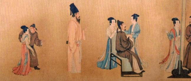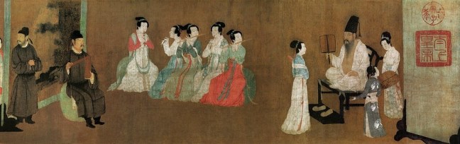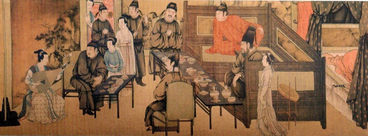 Gu Hongzhong’s Night Revels of Han Xizai 顧閎中 韓熙載夜宴圖 depicts the life-style of Han Xizai.