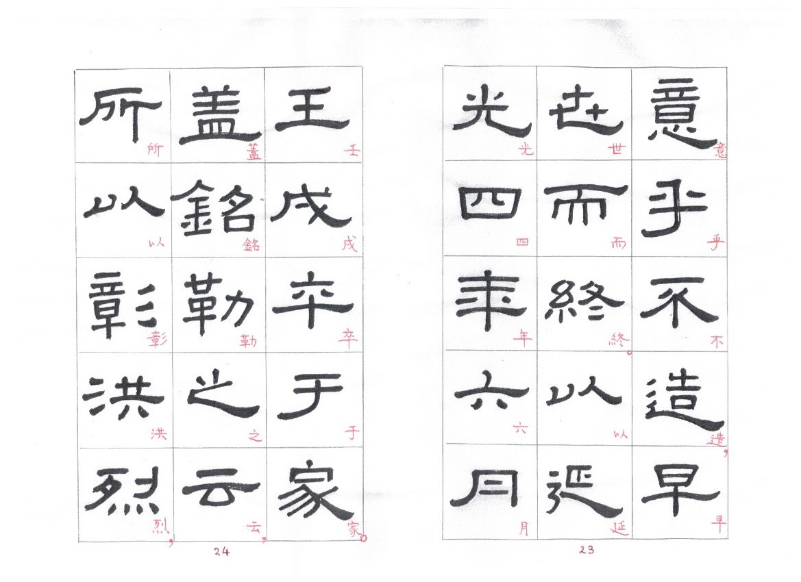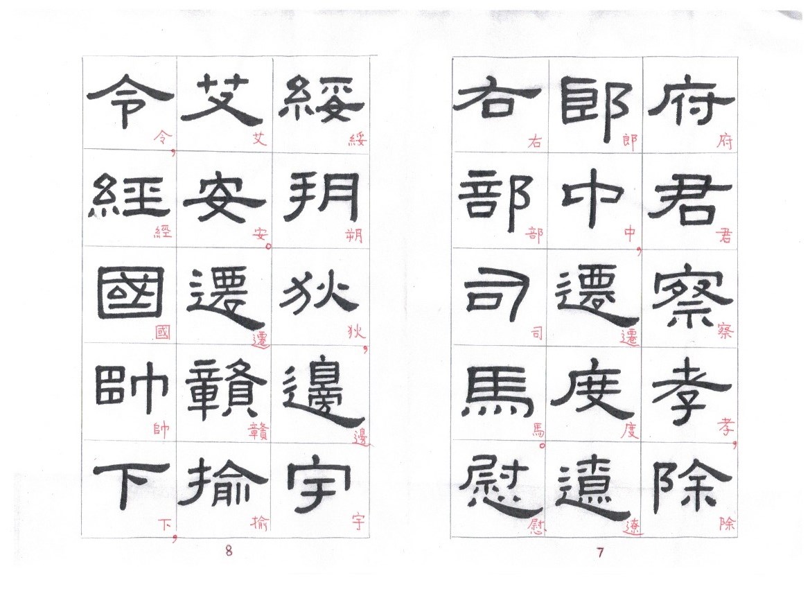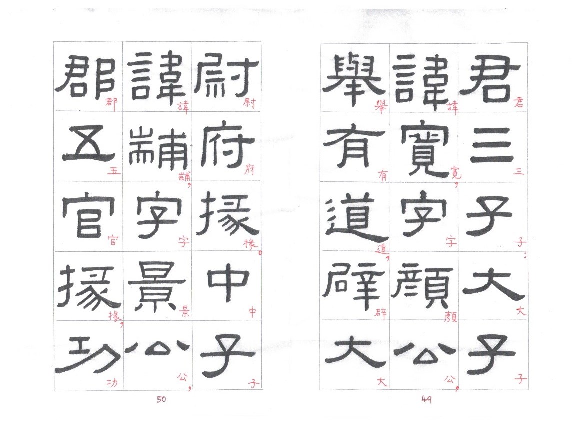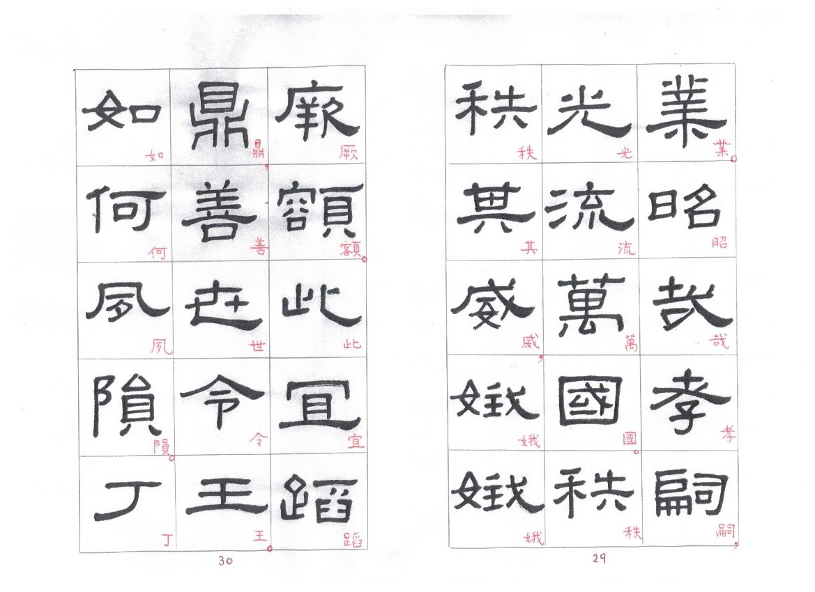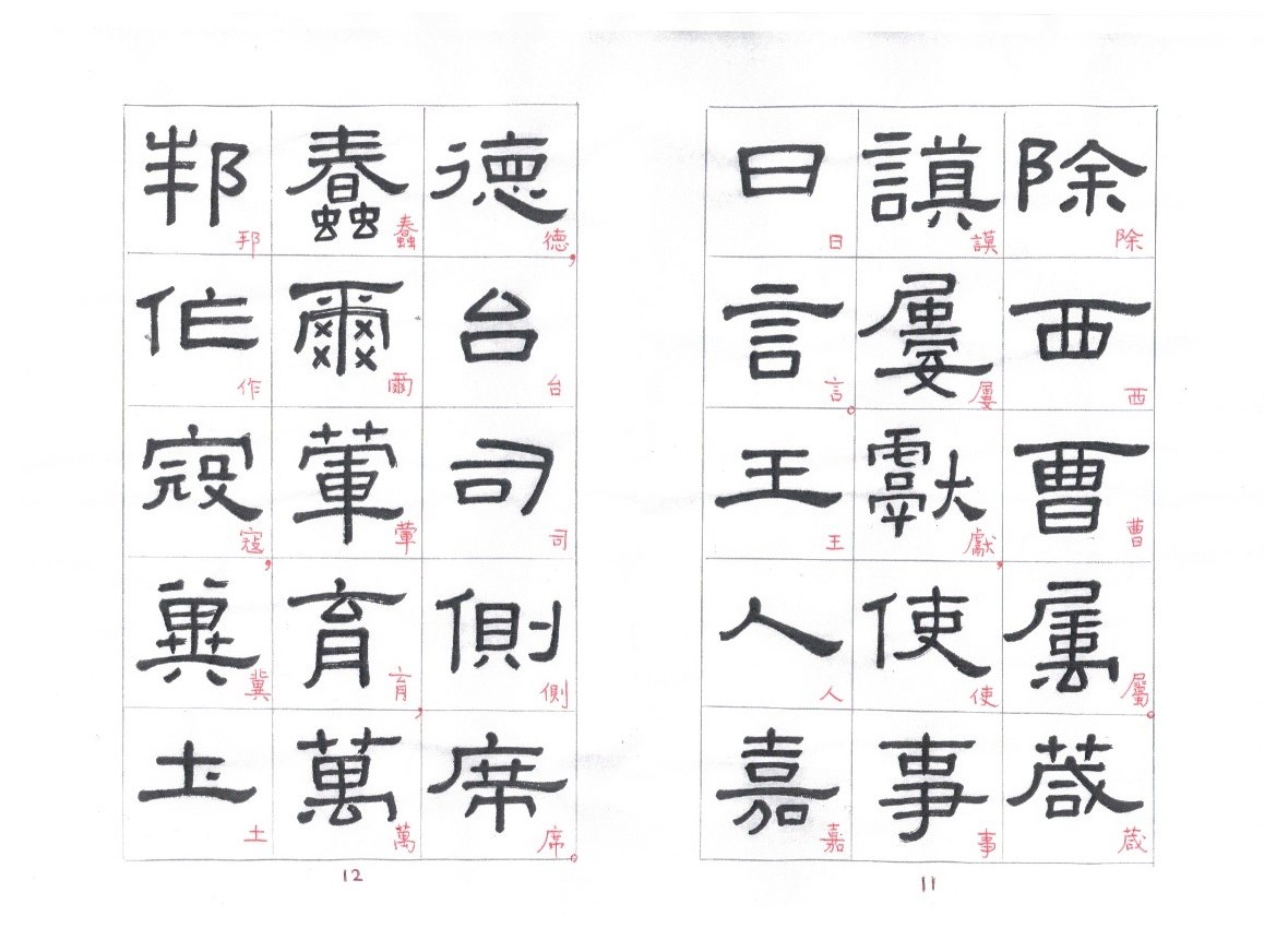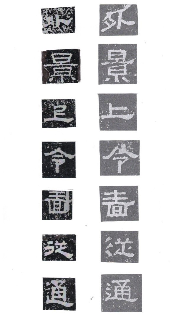 Some of the characters appear in the stele more than once. The following characters are good examples of those characters. Out of the variations of each character, the first one seems to be more typical.