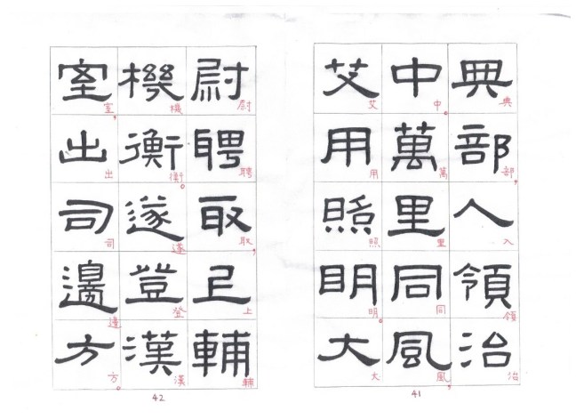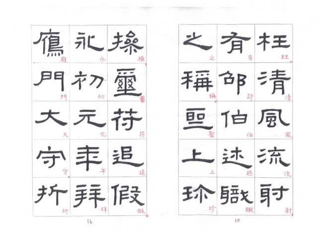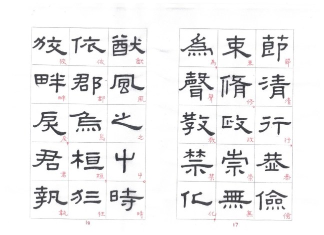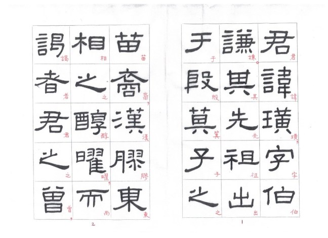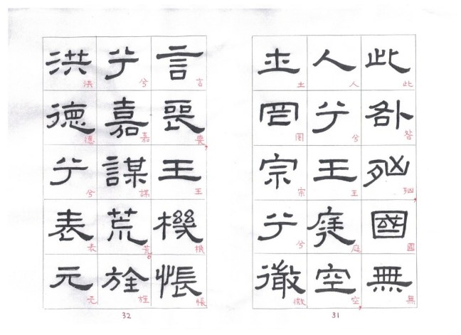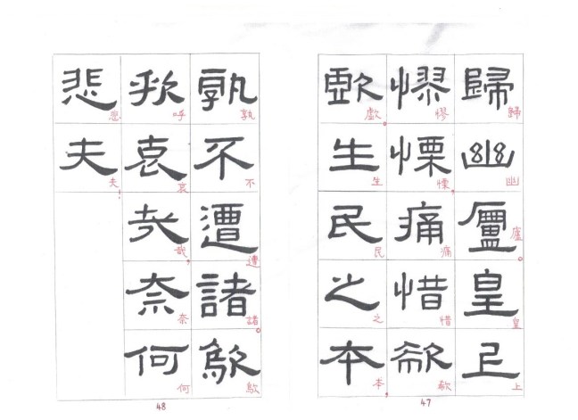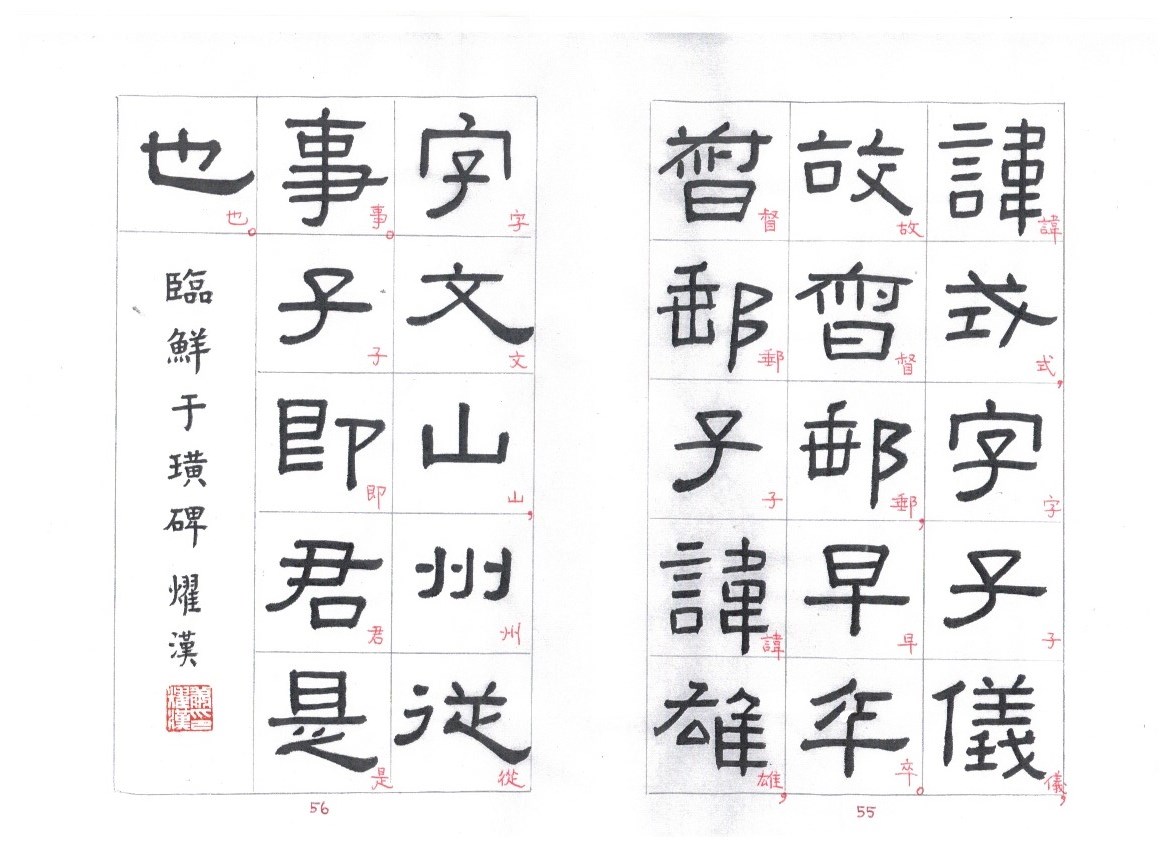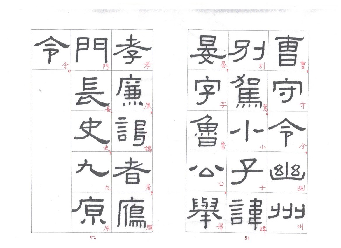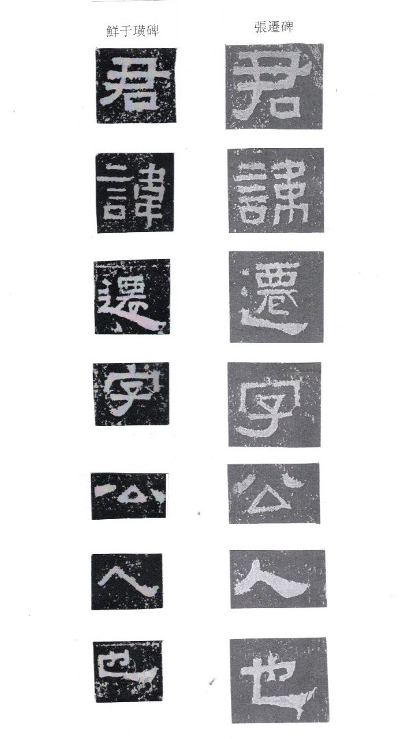 The strokes are thick and solid, most with right-angle bends. In starting or ending a stroke, touches of the brush tip are concealed. The undulating strokes are very delicately executed, and the pauses and transitions are well handled. This style of writing is known as fang bi (方筆). Zhang Qian Bei (張遷碑) is a typical example of fang bi writing. Some calligraphers think that Xianyu Huang Bei is even more attractive than Zhang Qian Bei. Personally I prefer Zhang Qian Bei. I cut and pasted characters from rubbings of these two steles and put the corresponding characters side by side so that the readers can compare between the two steles.