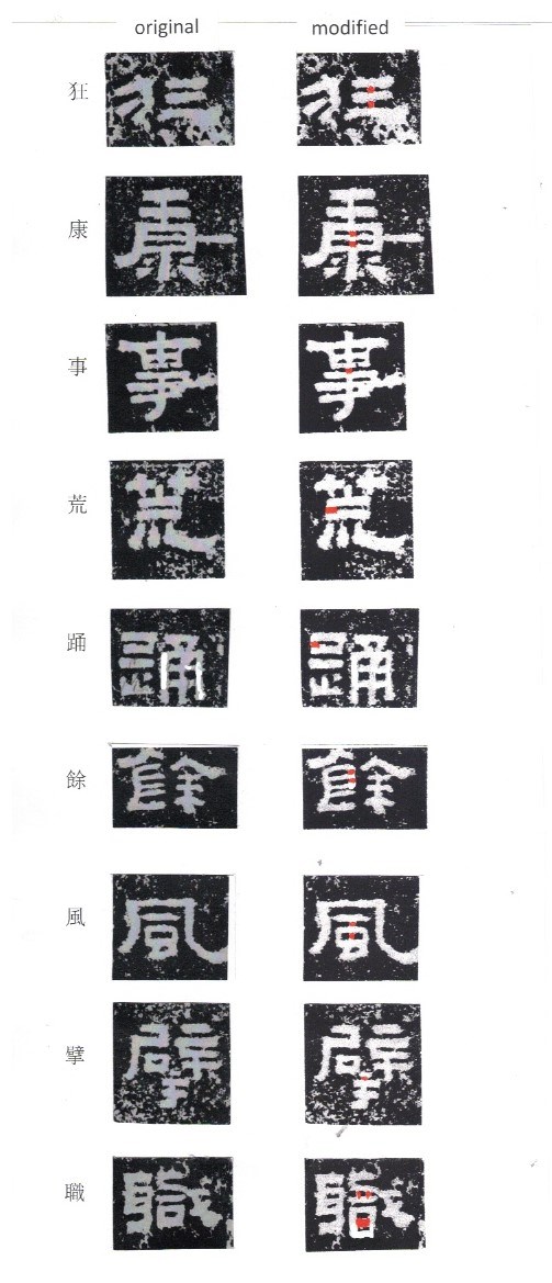 In some characters, some strokes are missing, but we can still recognize those characters. Perhaps a stroke or part of a stroke can be added as in the modified characters.