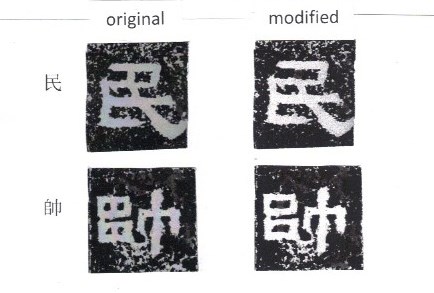 Some characters like 民 and 帥 have additional strokes. In many other steles, those strokes are not present as in the modified characters below.