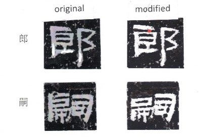 In characters like 郎 and 嗣, the first horizontal stroke on the top left side is connected to the far left vertical stroke. This is quite special. In other steles, the characters are like the modified ones as below.