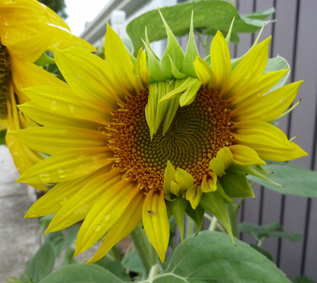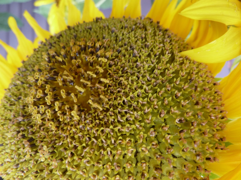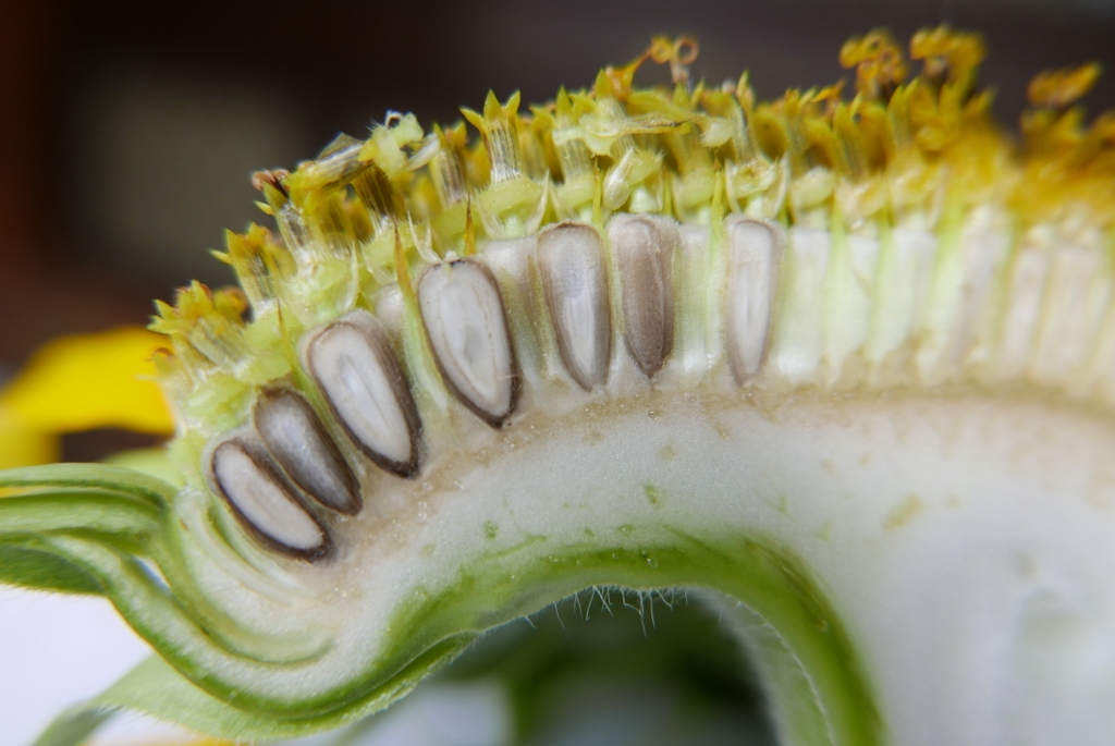 The disk flowers are arranged spirally. Generally, each floret is oriented toward the next in such a way producing a pattern of interconnecting spirals. Mathematicians worked out the pattern to be related to Fibonacci numbers. This pattern produces the most efficient packing of seeds within the flower head.