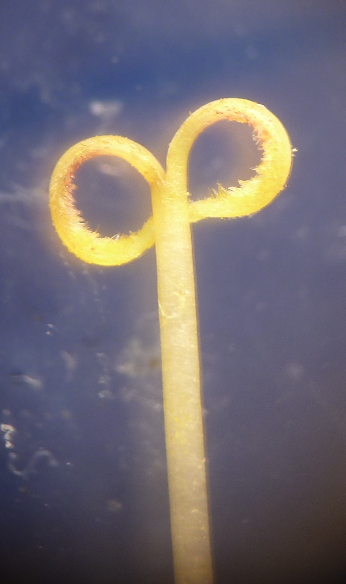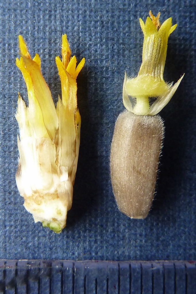Each disc flower consists of an inferior ovary, two pappus scales (modified sepals) and a tubular corolla formed by the fusion of 5 petals except at the tip. 5 anthers are united to form a tube, this is known as syngenesious stamens. The anthers have separate filaments attached to the base of the collar tube. Inside the anther tube is the style which terminates in a bifid stigma.