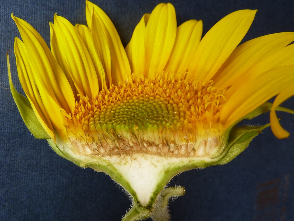 The ‘flower’ of sunflower is actually a ‘flower head’ or capitulum (or pseudanthium) of many individual flowers (florets). There are two types of flowers. The outer flowers, which resemble petals, are called ray flowers. They are sexually sterile and yellow in colour. The flowers in the center of the head are called disk (disc) flowers. They are yellow to maroon in colour and are fertile and mature into fruit (sunflower “seeds”).