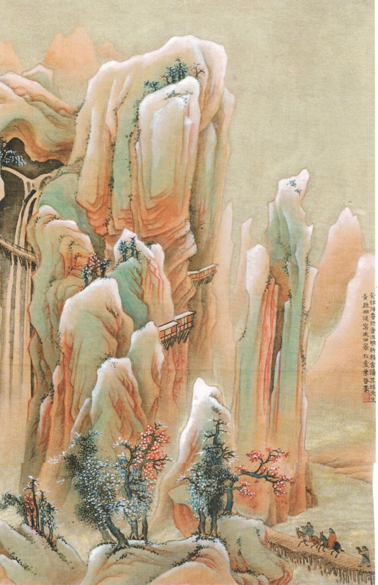 Ip Chit Hoo (1963) Winter (冬景), ink and watercolour on golden coloured paper, about 47 x 30 cm. Inscriptions: 癸卯仲春於香江明新精舍讀(温)其球先生青綠册後寫成四景 松盦葉哲豪 Seal: 松盦(朱紋)