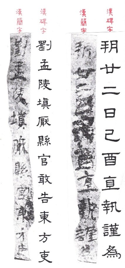 The style of ink writings on those media are quite different from those engraved on stone. Those ink writings are more lively or casual whereas those clerical scripts engraved on stelae are more regular, uniform and formal. The ink writings on bamboo and wooden slips might be impromptu works whereas writings to be engraved onto stone might be better planned. To illustrate this we can compare the clerical scripts on Li Qi Bei (禮器碑) (156 CE) with the writings on a urn dated the same year.