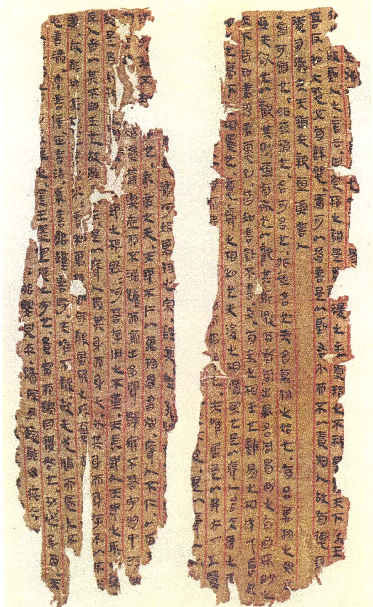 Laozi Daode Jing (老子道德經) written in ink on silk in the Western Han (西漢) Dynasty was unearthed in 1973 from Mawangdui Han tomb No 3, Changsha, Hunan province (湖南長沙馬王堆漢墓). The invaluable artefact is now kept in Hunan Provincial Museum, Changsha. It is a Taoist classic written on silk in the older clerical script and arranged in columns separated by red straight borderlines. Some of the characters use the structure of the seal script (篆書) but have a transitional form that falls between the seal and clerical scripts.